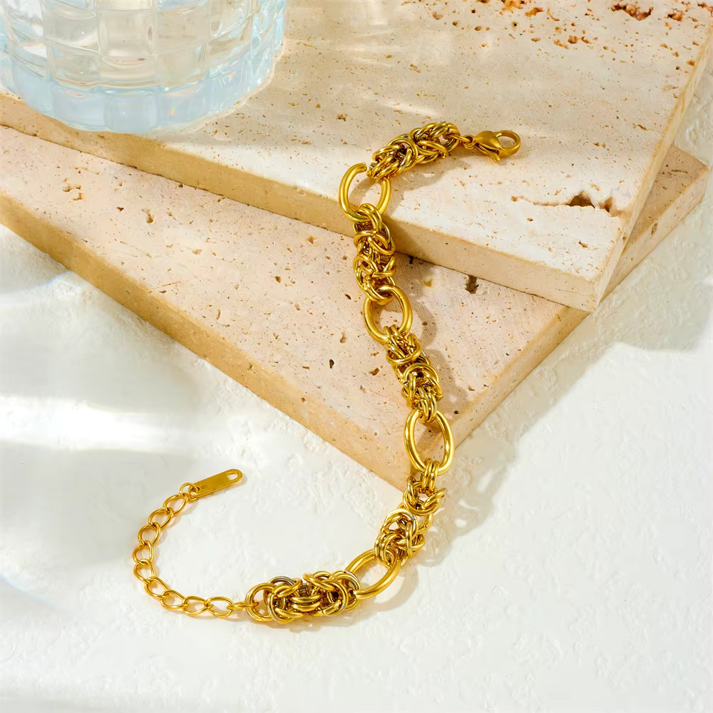 It's got the perfect mix of styles, blending chunky, smooth oval links with a beautifully detailed, textured chain. The warm gold tone and unique design make it a great everyday accessory or a standout piece for a night out.