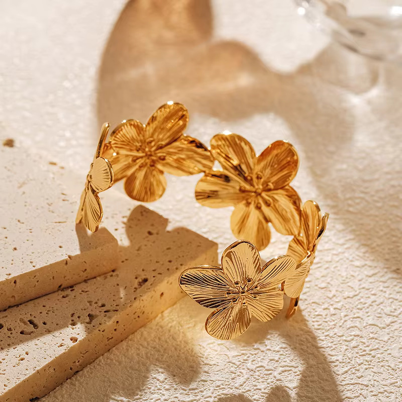 Adorn your wrist with this stunning Gold Bloom Bangle. Featuring a series of beautifully detailed, interlocking flowers with a polished finish, this cuff-style bracelet adds a bold yet feminine touch to any look. It's a statement piece that captures the timeless elegance of nature, perfect for adding a touch of glamour to your daily wear or for a special occasion.