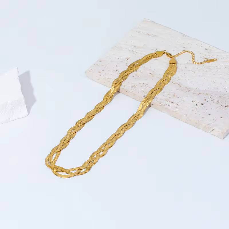 Drape yourself in luxury with The Cleopatra Snake Chain Necklace. This magnificent gold-tone necklace features a unique design with three woven herringbone chains that lie flat and fluidly against the skin, catching the light like liquid gold. A bold and powerful piece, it adds instant, head-turning glamour to any neckline