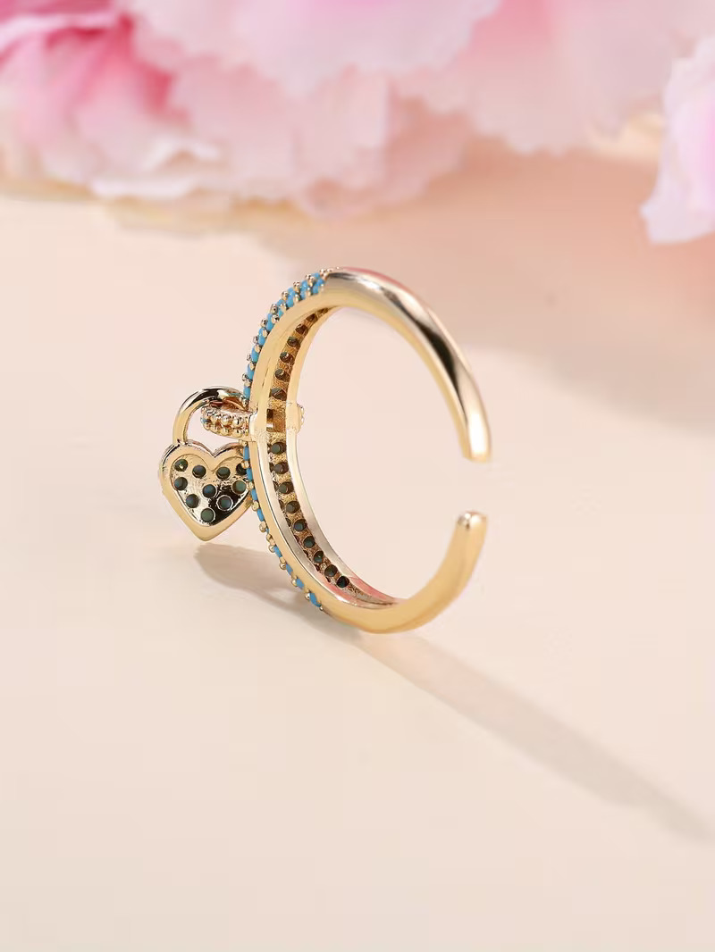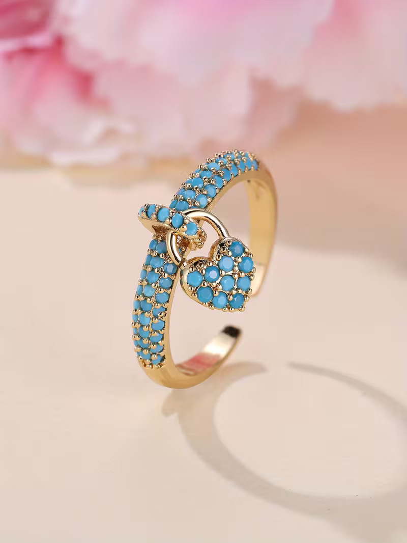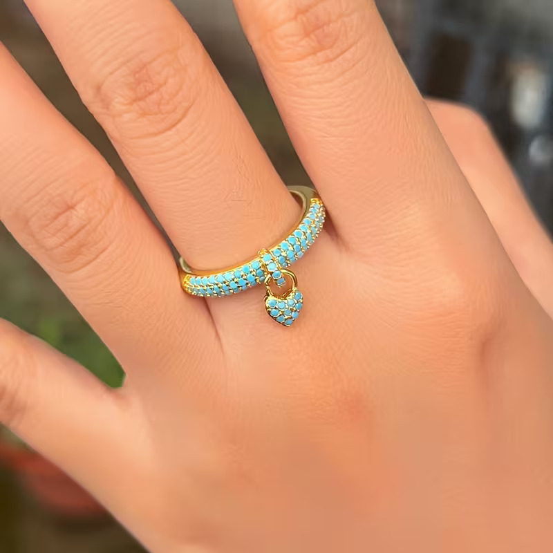 Embrace bohemian romance with our Love Lock Charm Ring. This eye-catching gold-tone ring showcases a sparkling pave setting, where the open band is meticulously adorned with brilliant turquoise-colored stones. A perfectly matching, intricately detailed heart charm hangs delicately from the center. The adjustable open design ensures a comfortable fit, making this a beautiful and meaningful statement piece