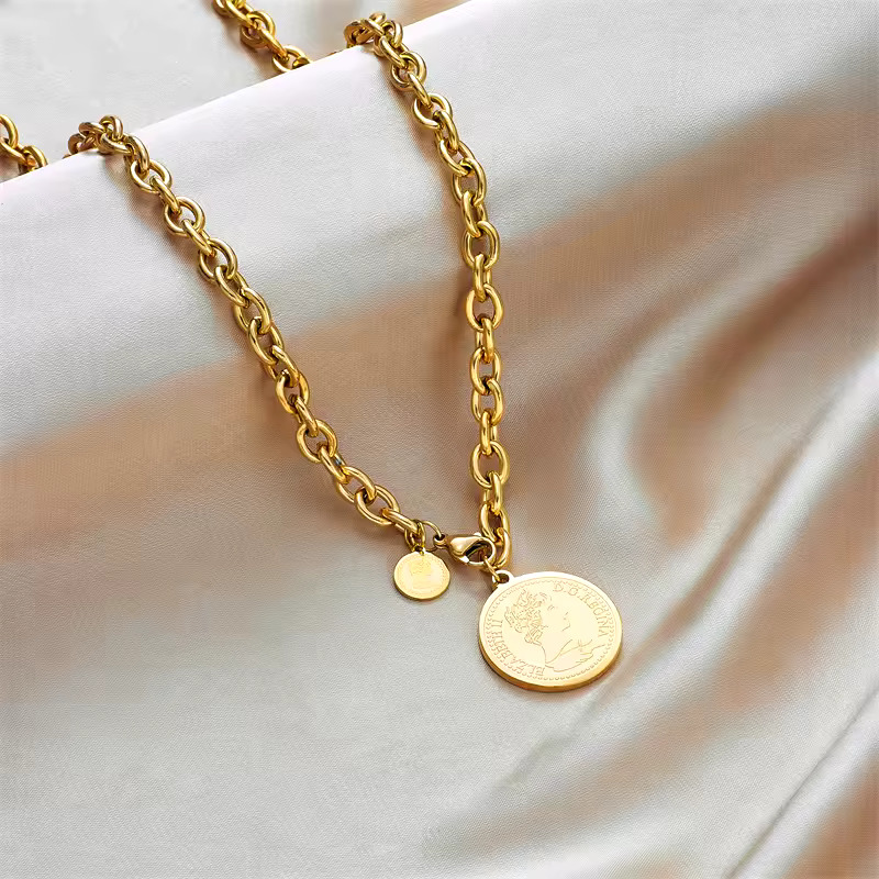 Stylish gold-tone necklace with a large coin pendant showing queen face. Features a bold chain and a small matching coin charm. A classic and elegant accessory.