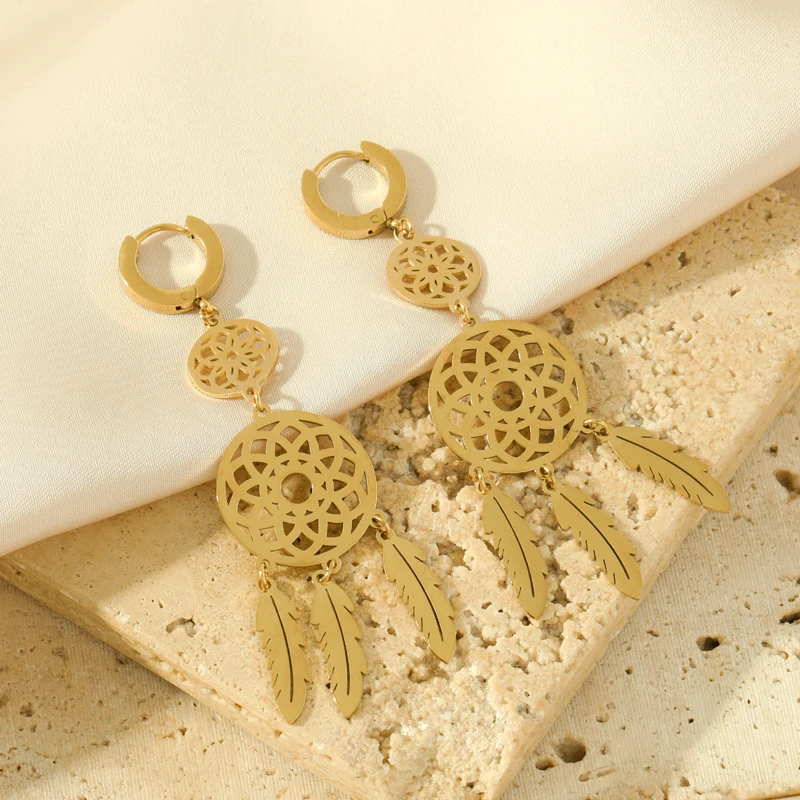 تتميز هذه الأقراط الذهبية اللافتة للنظر بتصميم طبقي جميل، يذكرنا بصائدة الأحلام. تحتوي على أنماط مقطوعة دقيقة وتعليقات ريشية رقيقة تتدلى من الأسفل. إكسسوار فريد وجذاب للأنظار.