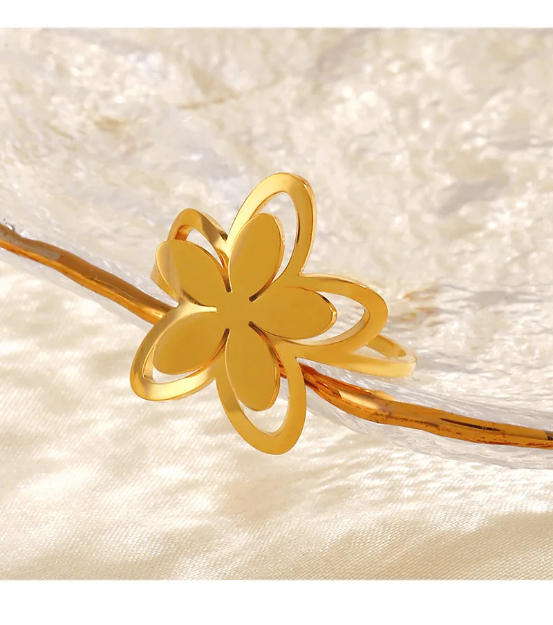 Embrace floral elegance with our Open Blossom Ring. This unique gold-tone ring features a beautiful, polished flower design with delicate, open-cut petals. A simple yet stunning statement piece that adds a touch of nature-inspired charm to any look.