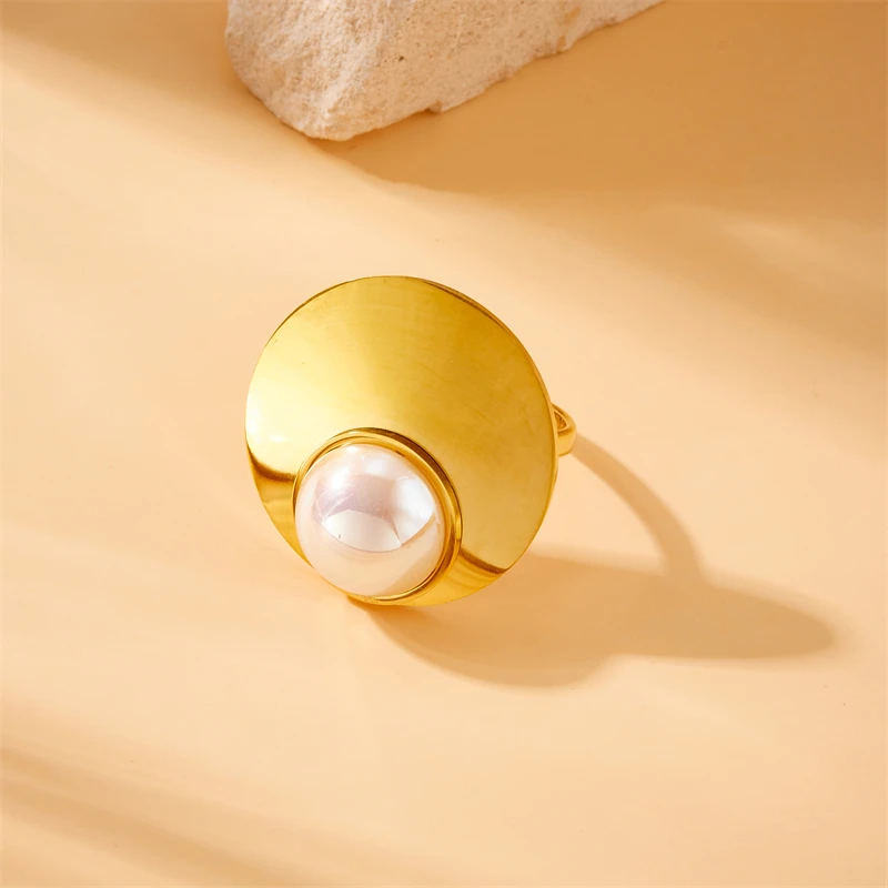 Make a bold, modern statement with our Gilded Orb Ring. This striking gold-tone ring features a large, polished circular face with a luminous faux pearl nestled at its center. Its clean lines and minimalist design make it a perfect accessory for the sophisticated woman