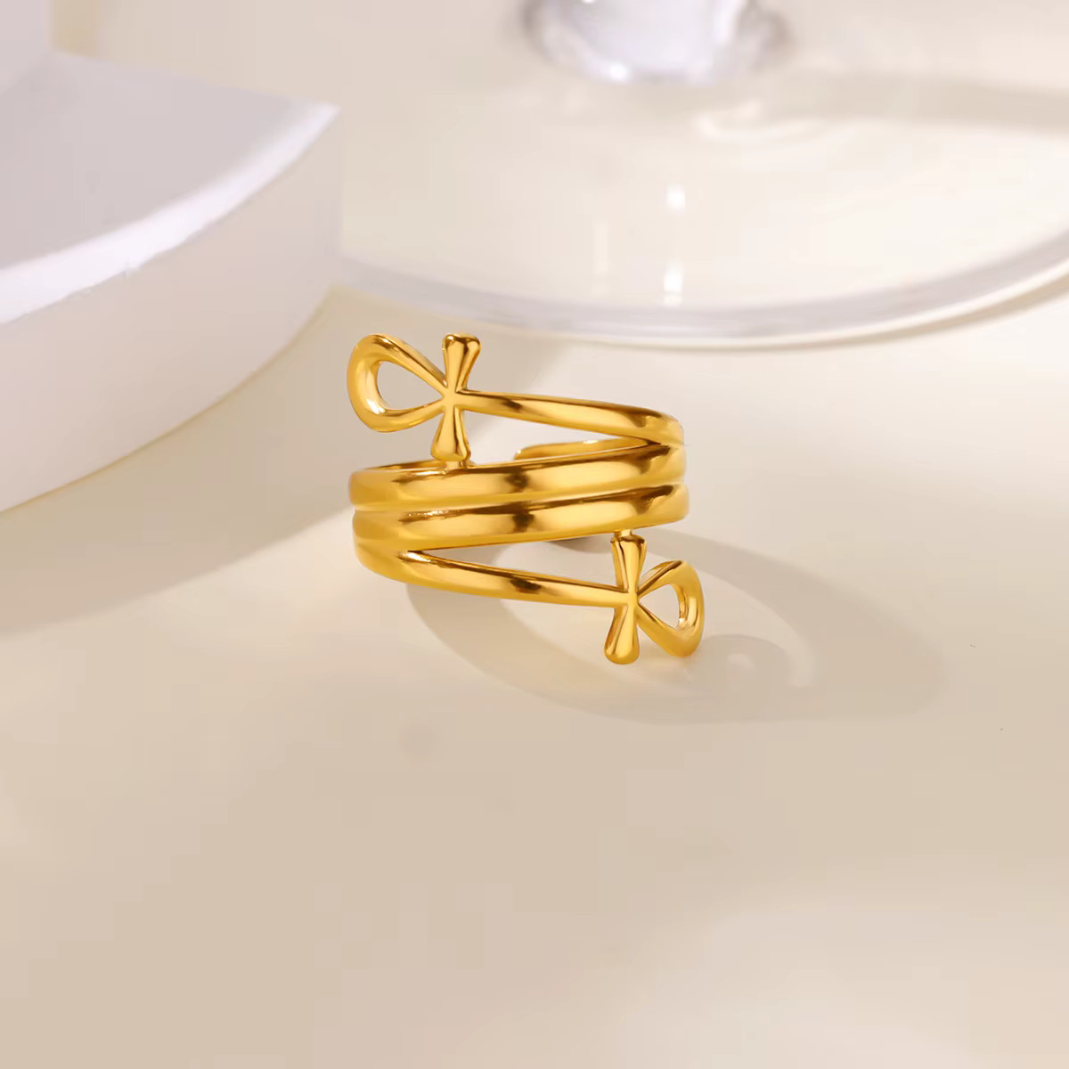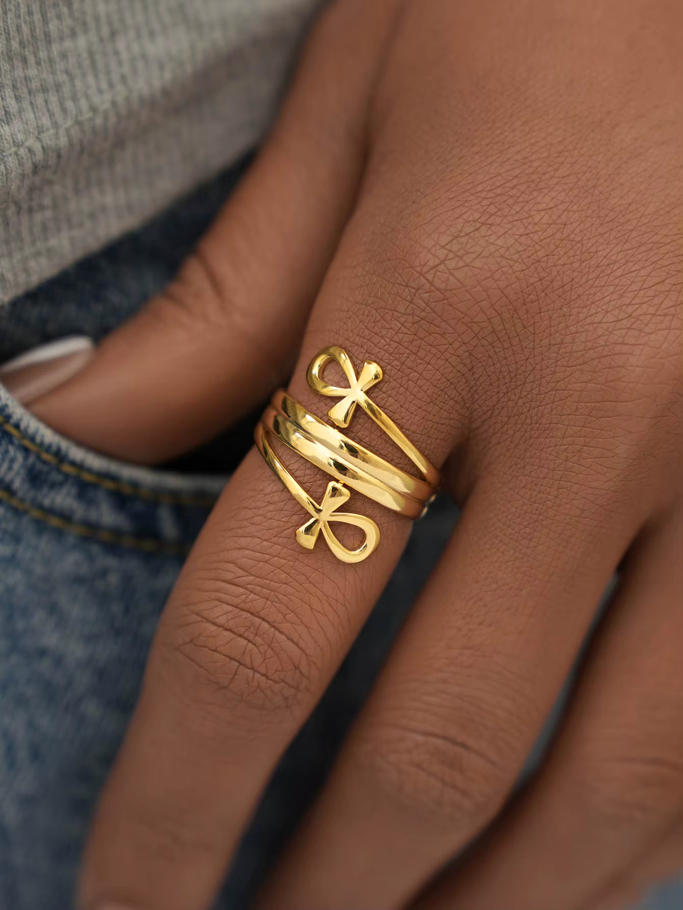 Channel the spirit of ancient Egypt with our Key of Life Wrap Ring. Crafted in a brilliant gold tone, this bold finger ring features a polished, three-strand coil design that wraps comfortably around the finger. Each end is beautifully finished with the sacred Ankh, symbolizing eternal life and protection. Its unique structure and powerful motif make it an unforgettable accessory